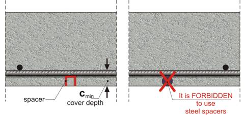 The simplest solution for providing the necessary cover depth of the reinforcement is special plastic spacers like the ones shown in the above figure. Usage of steel rebar spacers is forbid-den as they are highly susceptible to corrosion.
