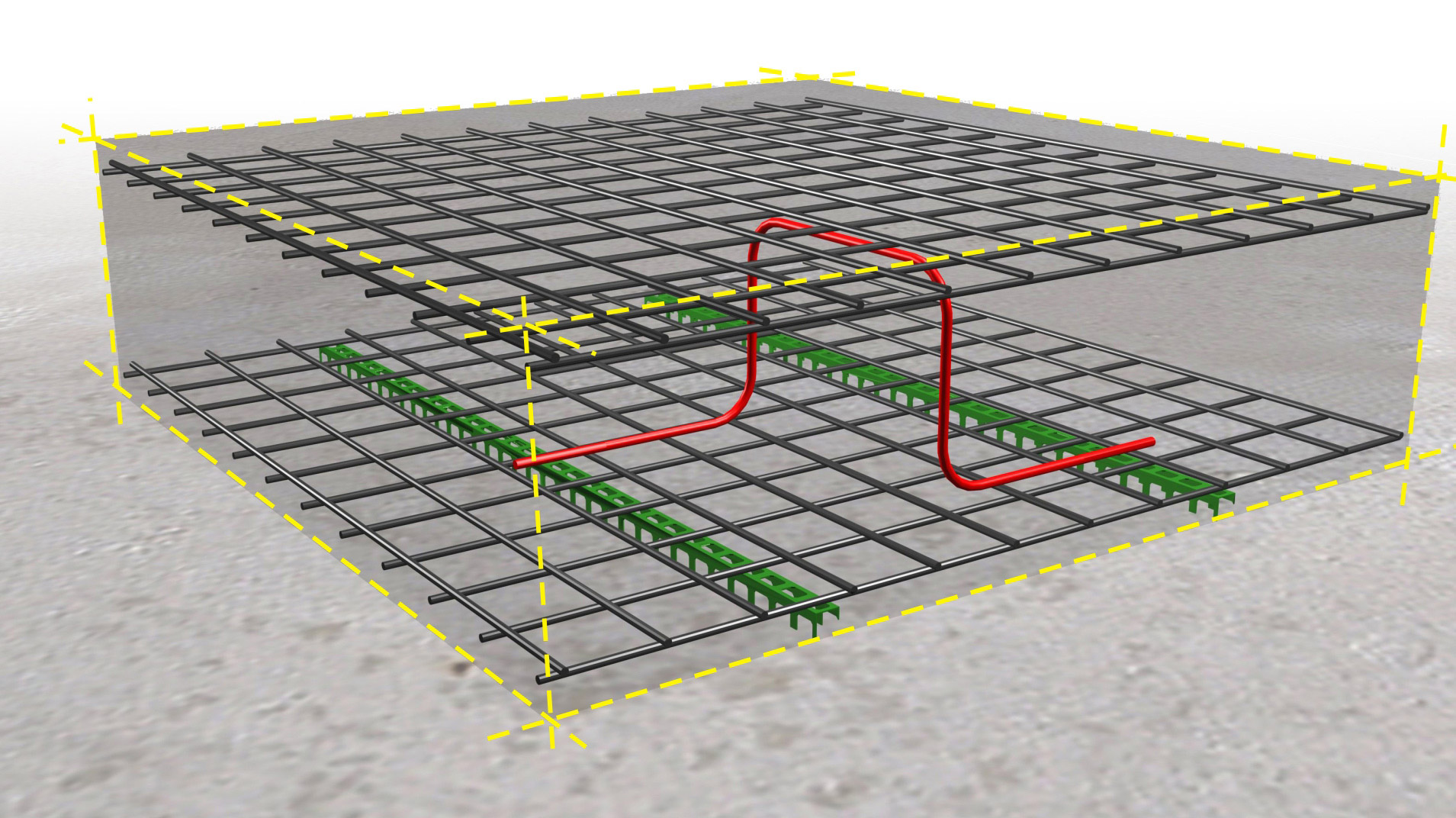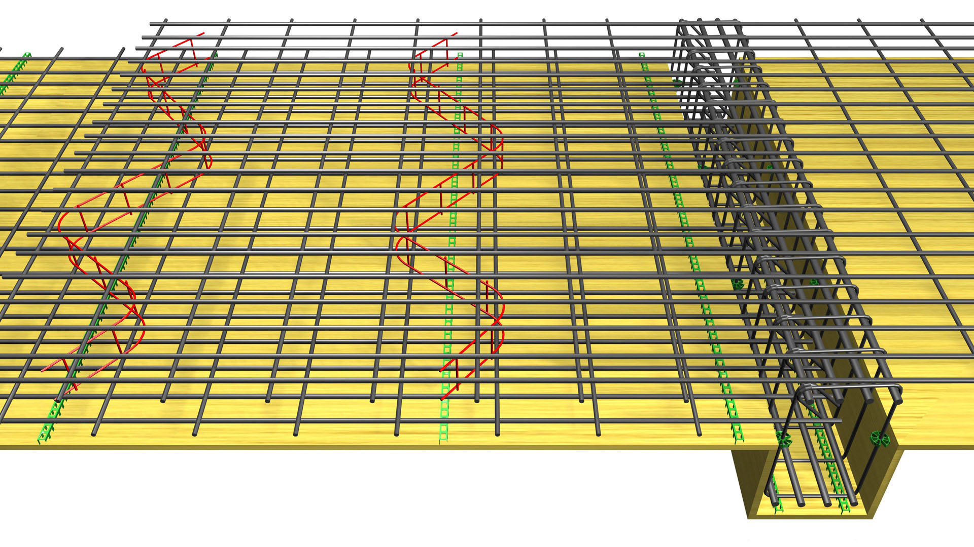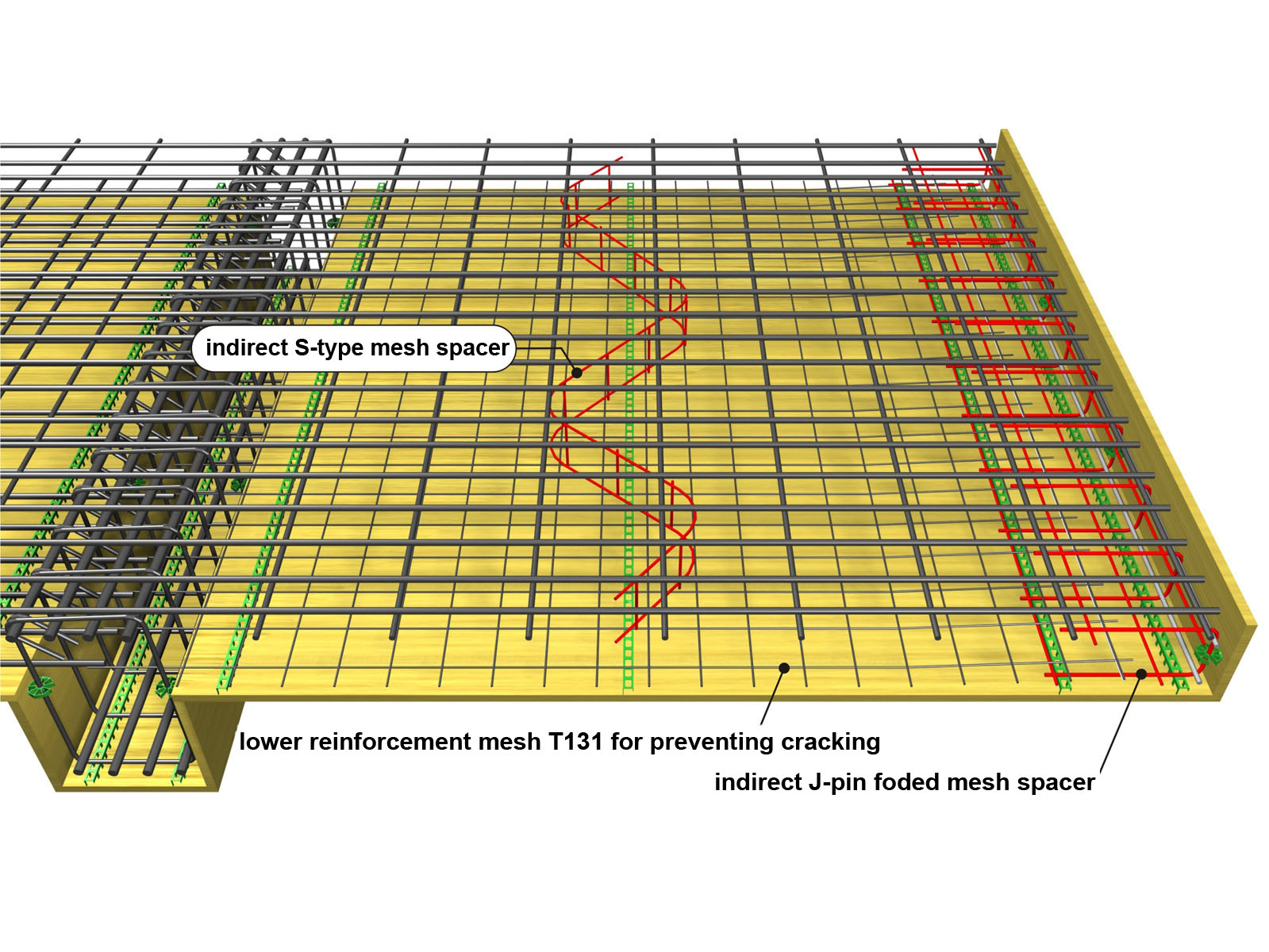 Just like in superstructure slabs, in the areas around the slab edges, “J-pin” rebars may be combined with open or closed reinforcement mesh.