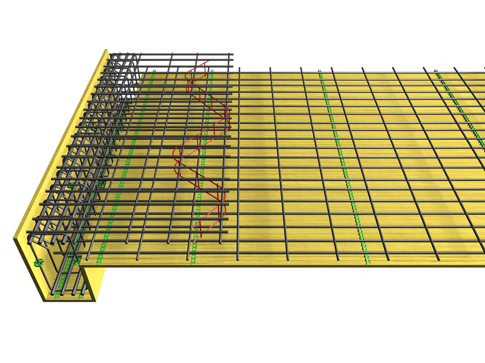 Cover depth of the slab’s lower reinforcement is secured with the use of plastic spacers.