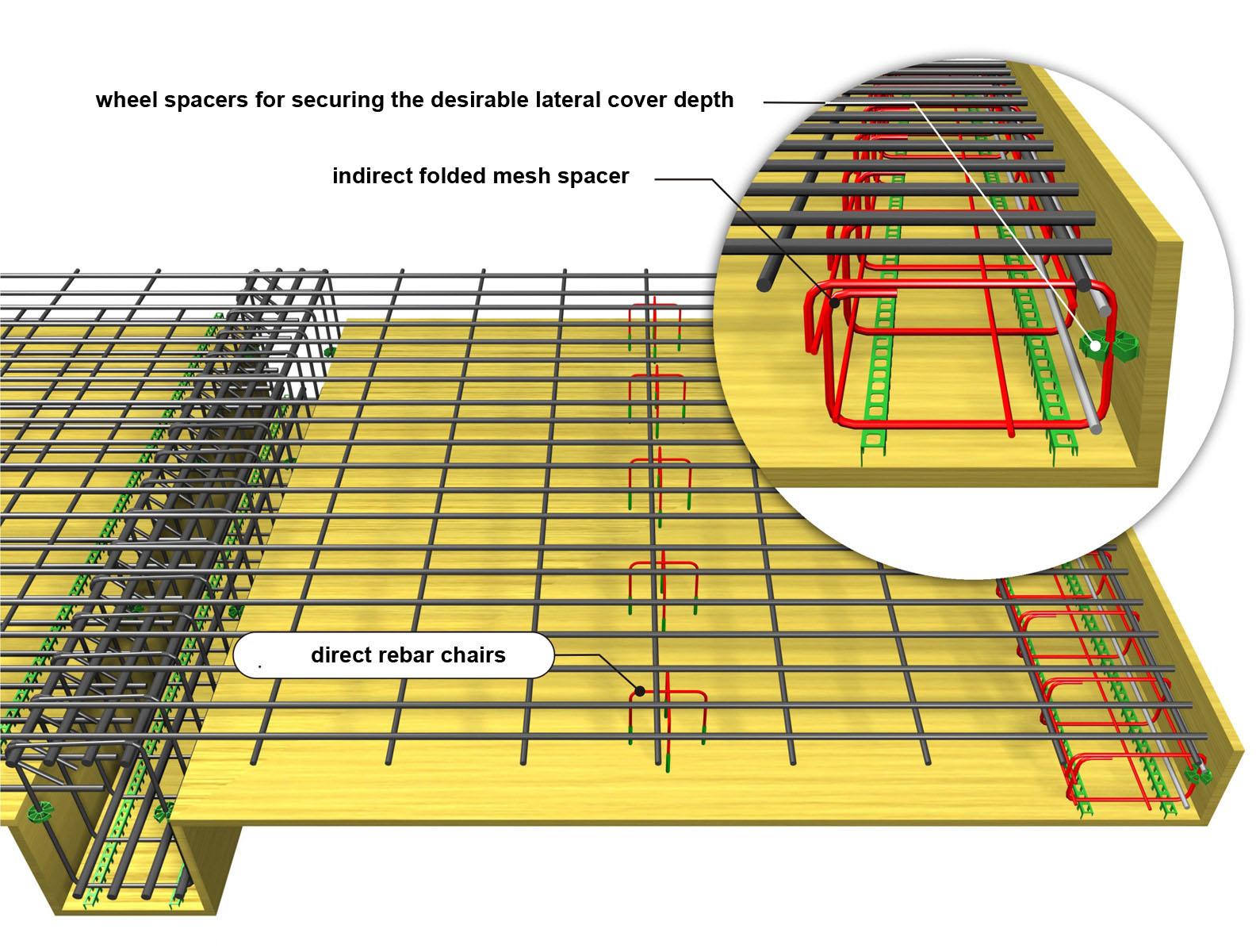 It is mandatory to prevent the folded mesh spacer from lateral slipping and this can be achieved with the use of local spacers. They must be placed right after the implementation of the folded mesh spacer and prior to its tieing with the slabs’ reinforcement. When using disk spacers extra attention should be paid to their vertical placement so as to avoid drifting during concreting. However when they are used in slab edges (as shown in the above figure) they can be horizon-tally placed since concrete does not fall directly upon these areas.