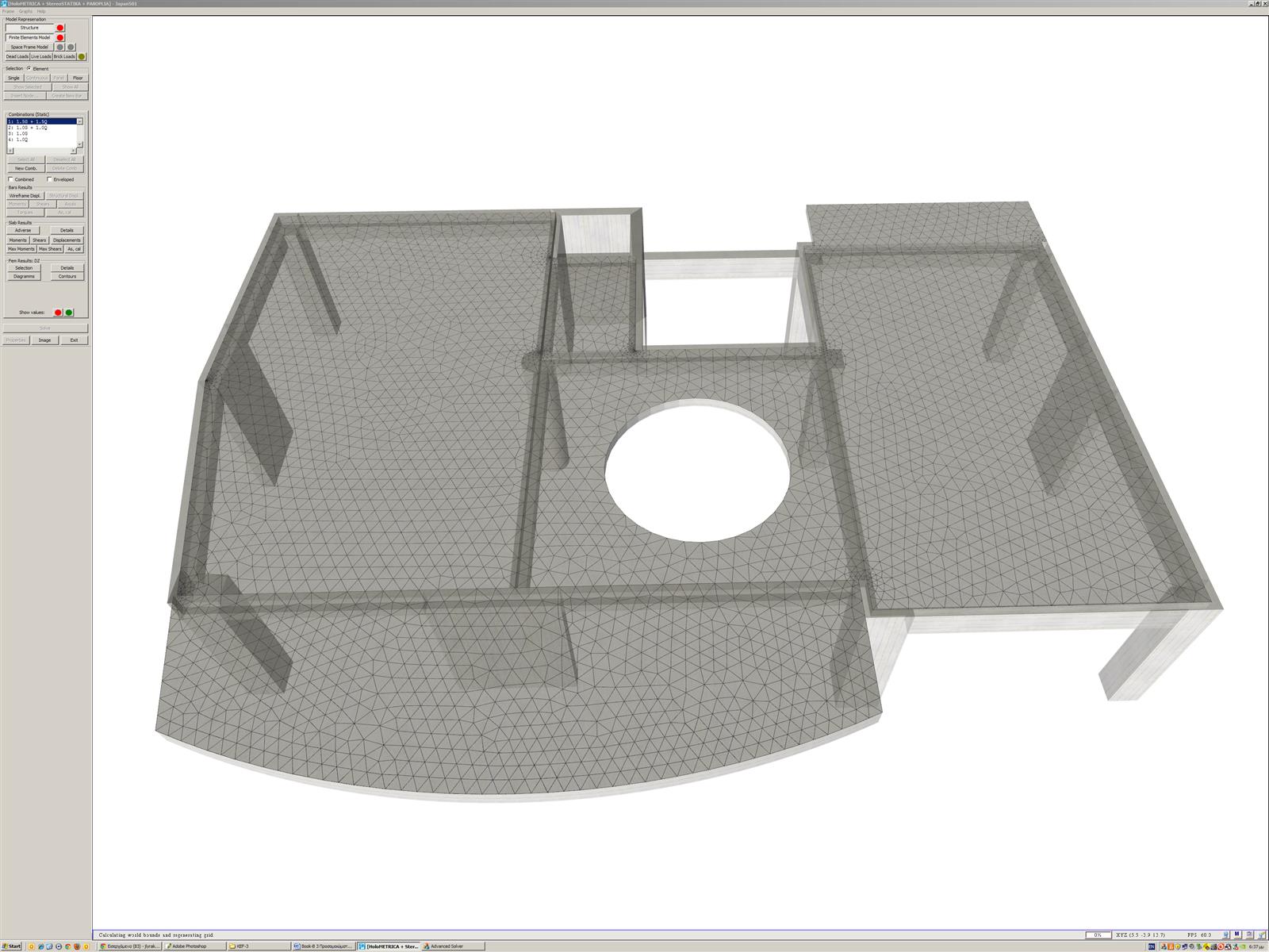 (b) The second one models beams and columns with bar finite elements, while slabs and shear walls are modelled with two-dimensional elements. The design seismic accelerations are applied on each mass m, resulting to seismic forces F=m·a used for the calculation of the structure's stress resultants [*]NoteNoteCertainly, the stress resultants of two-dimensional finite elements of the structure, should be integrated to values on equivalent bars regarding shear walls and on 1.0m wide bar-strips regarding slabs. This is mandatory since reinforced concrete structures are signed only for bending, shear and axial force and the minimum reinforcement quantities imposed by the regulations refer to cross-sections of those bars. On the contrary, in steel structures such integrations are not necessary since the maximum stresses on an element are sufficient enough to guarantee its resistance. . The mixed seismic model is used in special cases, mainly in structures of slabs and shear walls containing large holes functioning as sensitive 'necks' for carrying horizontal seismic forces, as shown in the following figures.