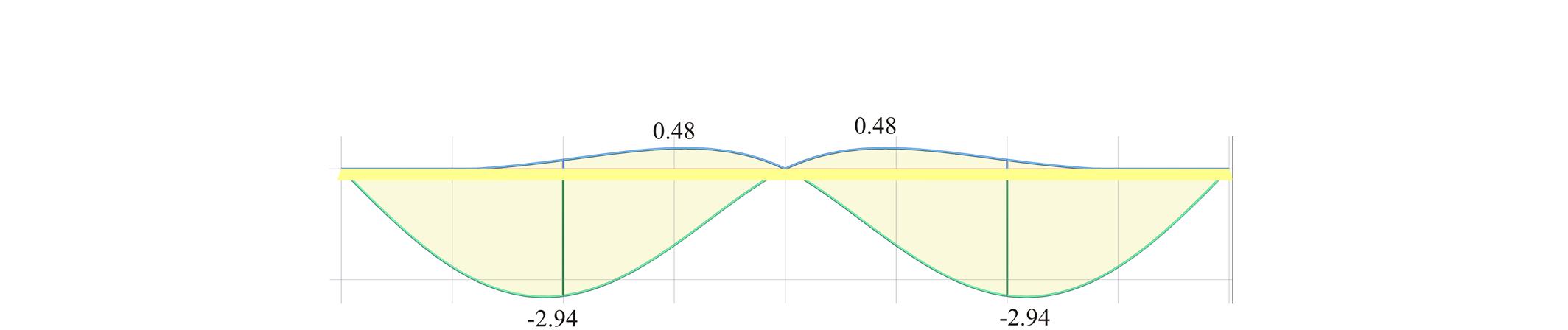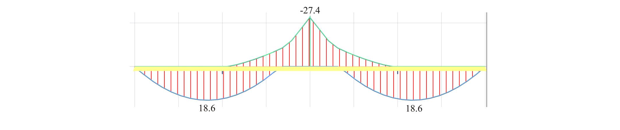 Notice that although the live load has a relatively high value, the shear forces do not differ more than 10%. Of course, this is due to the fact that only 2 spans exist and the unfavourable shear forces at the supports result from the global loading 1.35g+1.50q. The differences would be even higher in multiple spans.