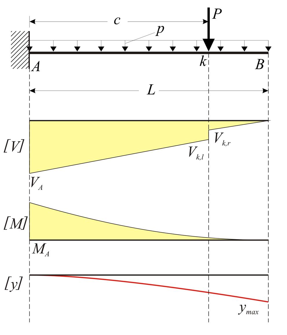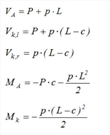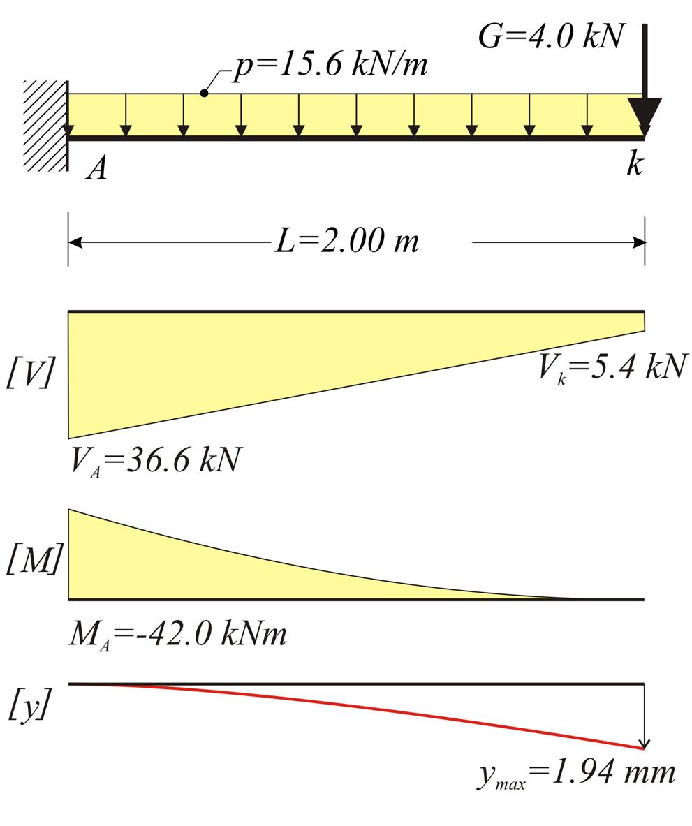 q=5.0kN/m2·1.00m=5.0 kN/m p=γg·g+γq·q=1.35x6.0+1.50x5.0=15.6 kN/m VA=P+p·L=5.4+15.6x2.00=36.6 kN Vk=VA-p·L=36.6-15.6x2.00=5.4 kN MA=-P·L-p·L2/2=-5.4x2.00-15.6x2.002/2=-42.0 kNm For C40/50 it is E=35.2x109 Pa [EC2, 3.1.2] and from volume C' §1.1 a I=b·h3/12=1.00x0.203/12=6.67x10-4 m4 E·I=35.2x109N/m2x6.67x10-4m4=234.8x105 N·m2 Due to uniformly distributed load p: