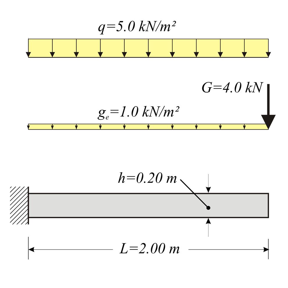 Cantilever slab with thickness h=200 mm, length L=2.00 m and concrete C40/50, is subjected to covering load gεπ=1.0 kN/m2, live load q=5.0 kN/m2 and concentrated load G=4.0 kN/m applied at the end. Calculate bending moments, shear forces and deflections in ultimate limit state.