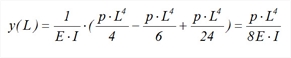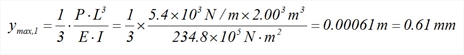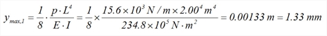 In total: ymax=ymax,1+ymax,2=1.33+0.61=1.94 mm The calculated deflection corresponds to the ultimate limit state. The deflection for serviceability limit state, would result considering the respective serviceability loads with values e.g. ps=1.0g+1.0q=1.0x6.0+1.0x5.0=11.0 kN/m and Ps=1.0G= 1.0x4.0=4.0 kN. Thus, the total deflection would be ys=1.33x(11.0/15.6)+0.61x(4.0/5.4)= 1.39 mm, of course, ignoring creep effects.