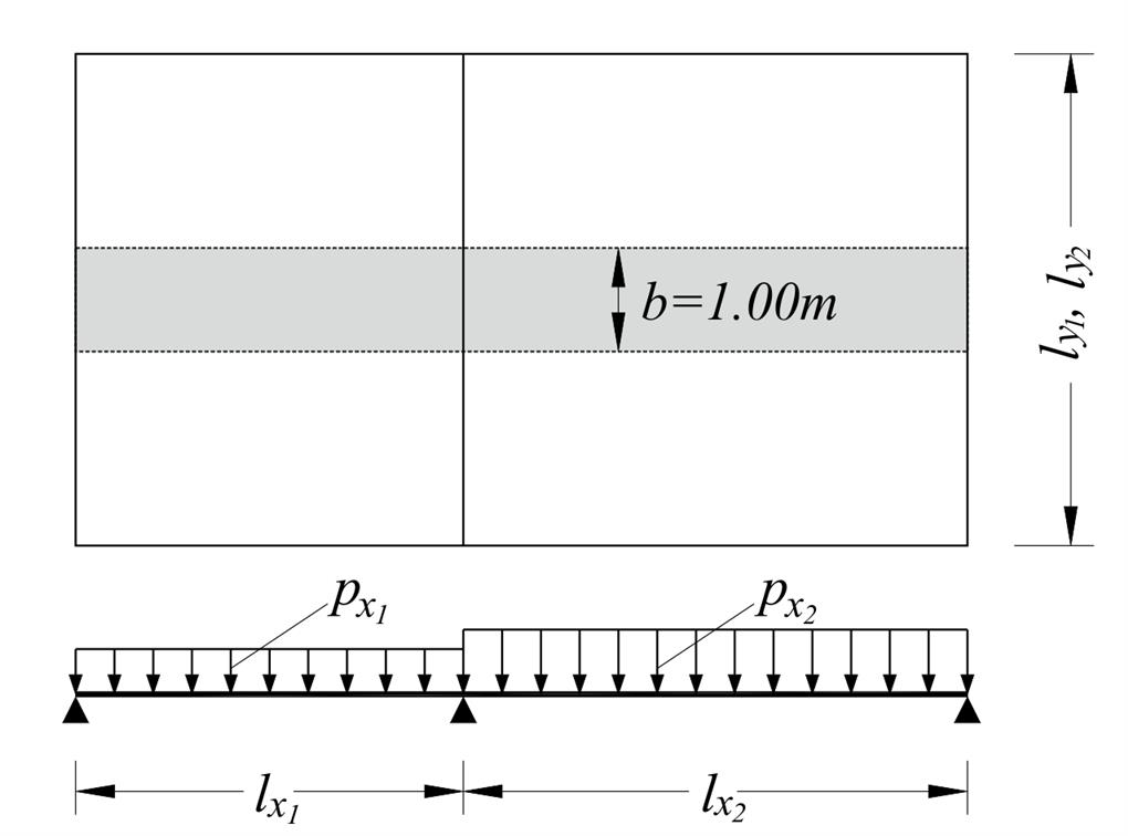 Strips are solved as continuous one-way slabs, with loads pxi and pyi applied on spans lxi and lyirespectively, using one of the known methods.
