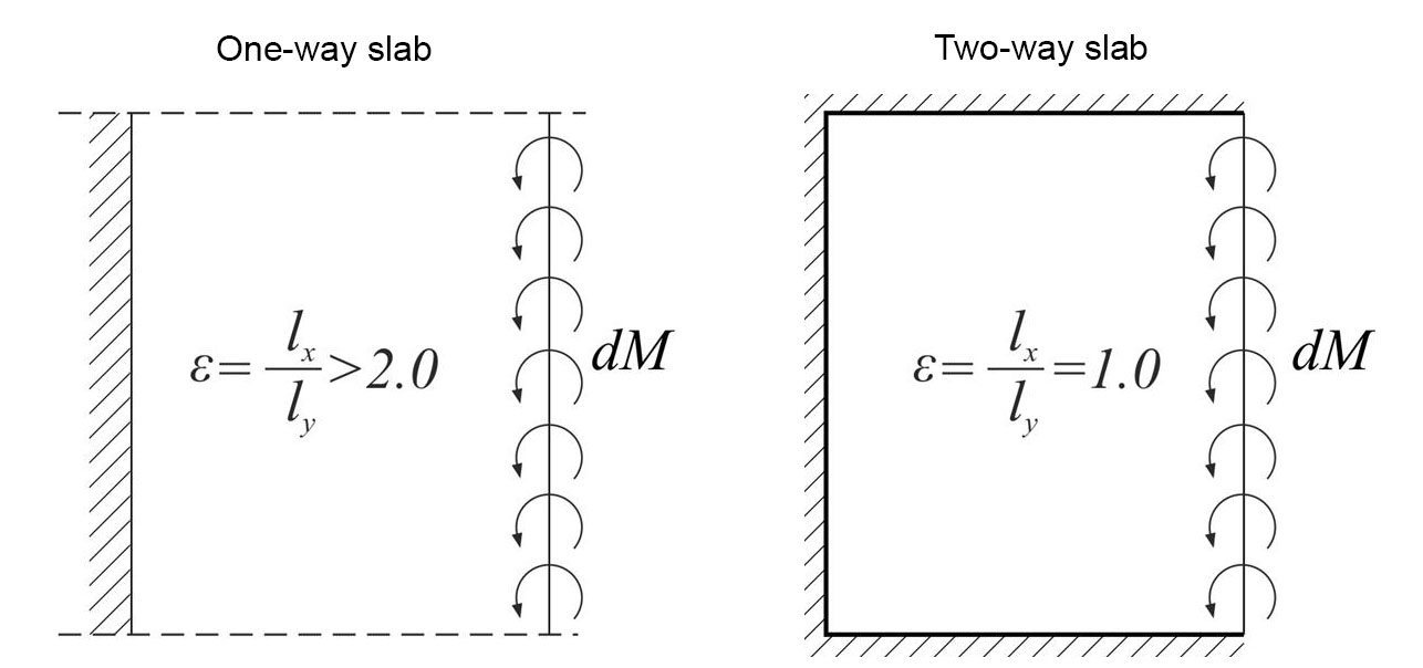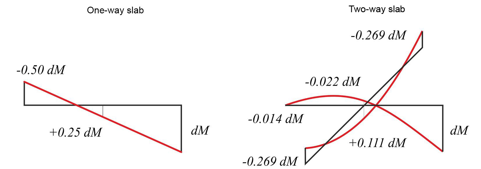 Figure 4.6.3.1-6: Half of the transfer moment dM on the support of a one-way slab is shifted to the opposite support(left diagram).The same transfer moment dM on the support of a two-way slab is “diffused” all over its surface (right diagram) Figure 4.6.3.1-6: Half of the transfer moment dM on the support of a one-way slab is shifted to the opposite support(left diagram).The same transfer moment dM on the support of a two-way slab is “diffused” all over its surface (right diagram)