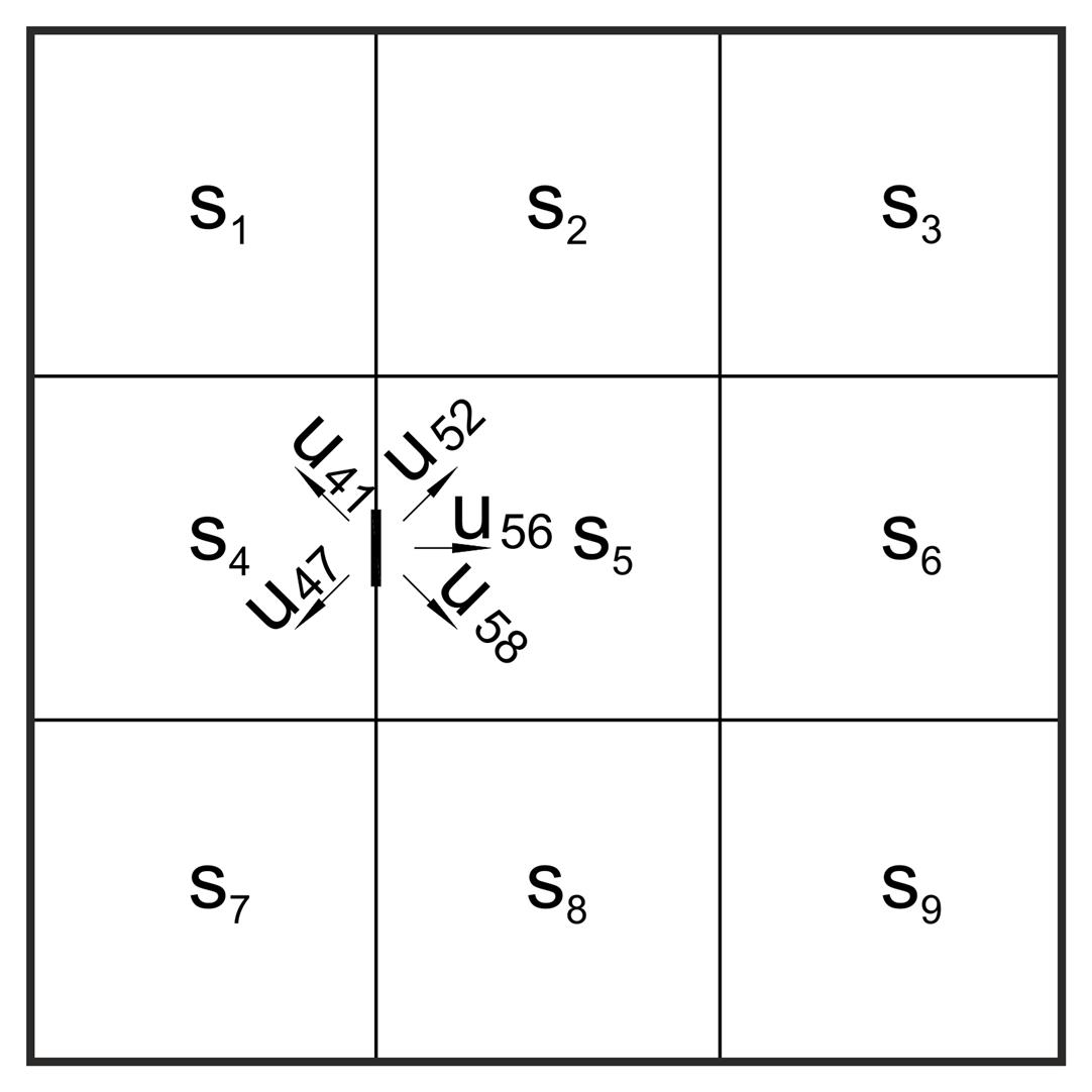 One support is freed, e.g. 45 of the figure, and distribution takes place on all directions (i.e. CROSS method on plane).