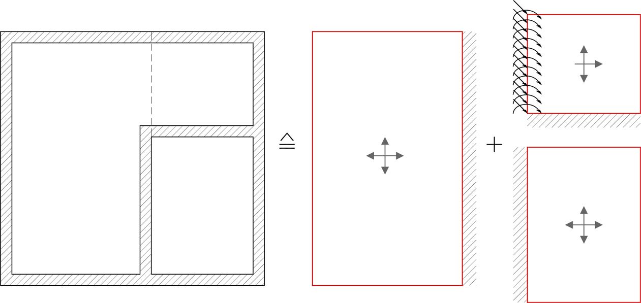 Slabs supported on three edges A three-edge-supported slab is the one supported along three edges, such as slab s5 illustrated in §4.1. Static analysis is performed similar to two-way slabs (i.e. considering each individual slab), by means of tables e.g. by Hahn. Moments are practically distributed according the approximate method of § 4.6.3.3. The tables support global uniform loads, continuous linear uniform loads on free edges and continuous linear moments on free edges. A slab of shape Γ is analyzed considering one three-edge-supported slab and one two-way slab, as shown in figure below. This method is proposed by Hahn and it requires particular attention reinforcing the slab. Indicatively, it is emphasized that continuous reinforcement should be placed along the lower fibers at the theoretical boundary of the two-way slab and the three-edge-supported slab.
