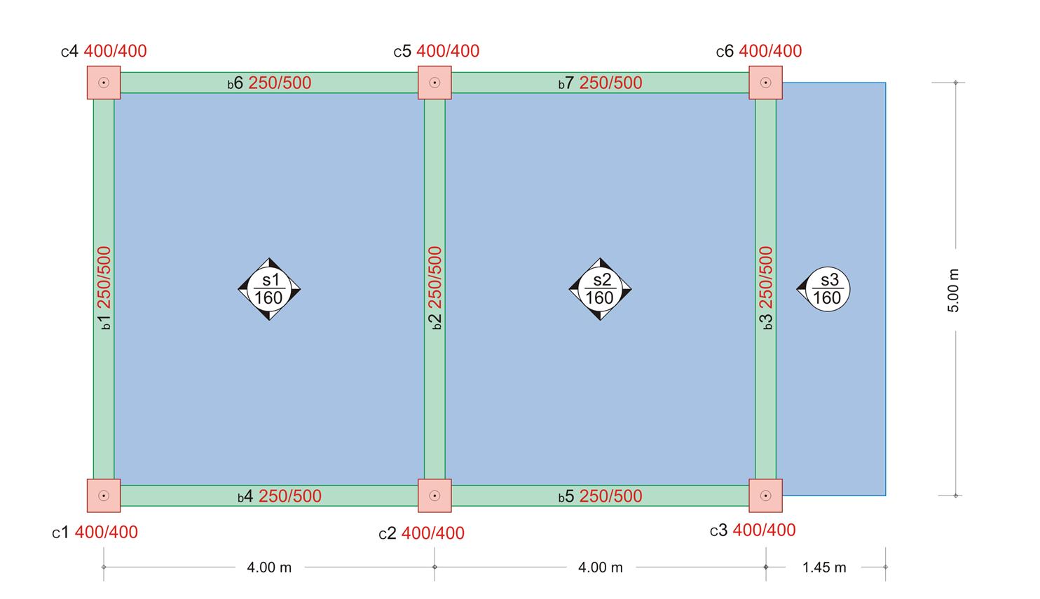 Due to the unknown influence of cantilever slab s3 on the adjacent one, for safety reasons, slabs s2 and s1 are considered fixed at one end.