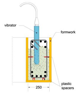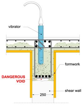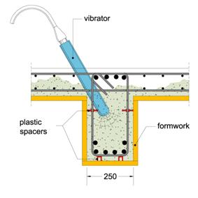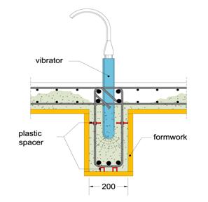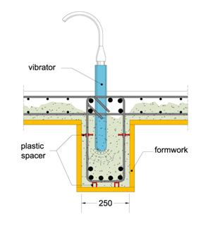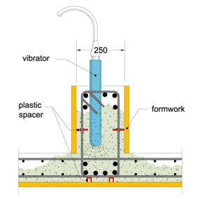 In the case where the beam is not connected on either side with a slab (foundation beams), the only way to vibrate the concrete is by the vertical placement of the device. (5)
