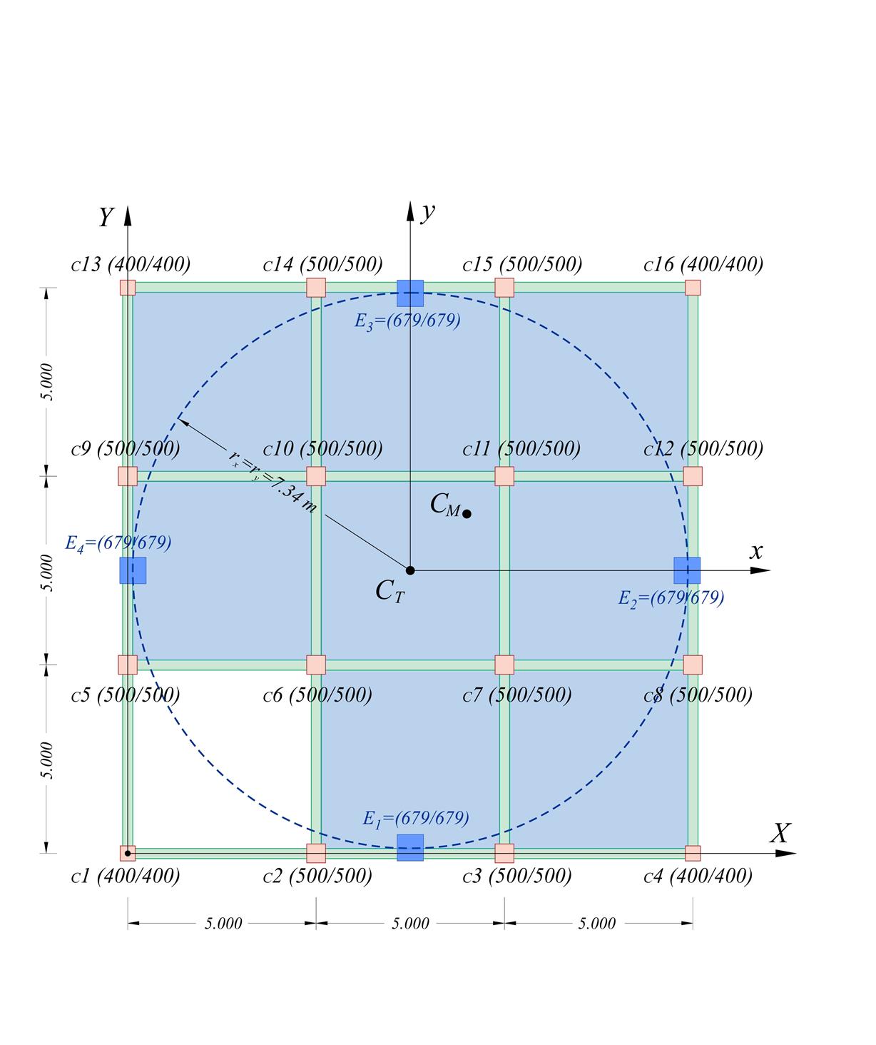 Select sheet B_547-1 of file "diaphragm_ortho.xls" containing the geometry of the 16 columns, the coordinates of centre of mass CM 9,00/9,00 and the seismic force Hx=2000 kΝ . Column C1 -although non diaphragmatic will be treated as belonging to the diaphragm as two beams frame into it and therefore behaves rather as a diaphragm one than as an inactive element. | δ x | δ y | Vx | Vy | Mx,1 | Mx,2 | My,1 | My,2 | | | (mm) | (mm) | (kN) | (kN) | (kNm) | | | | | C1 | 3,67 | 0,97 | 47,5 | 12,6 | 71,3 | -71,3 | 18,8 | -18,8 | | C3 | 3,67 | -0,32 | 116,0 | -10,2 | 174,0 | -174,0 | -15,3 | 15,3 | | C4 | 3,67 | -0,97 | 47,5 | -12,6 | 71,3 | -71,3 | -18,8 | 18,8 | | C6 | 4,31 | 0,32 | 136,4 | 10,2 | 204,6 | -204,6 | 15,3 | -15,3 | | C11 | 4,96 | -0,32 | 156,9 | -10,2 | 235,3 | -235,3 | -15,3 | 15,3 | | C13 | 5,60 | 0,97 | 72,6 | 12,6 | 108,9 | -108,9 | 18,8 | -18,8 | | C16 | 5,60 | -0,97 | 72,6 | -12,6 | 108,9 | -108,9 | -18,8 | 18,8 | The coordinates of the centre of stiffness CT are at point 7.50, 7.50 as expected due to the symmetric geometry of the columns. rx=7.34 m, ry=7,34 m, θz= -0,00012914, Kθ=23.230,8 MNm, Kxx=Kyy=431.5 MN/m Note: The sum of shear forces in each direction shall be equal to the corresponding seismic force, regardless of the stiffness distribution or the deviation of the CM from the CT, i.e. in this particular caseΣ(Vx)=2000 kN and Σ(Vy)=0
