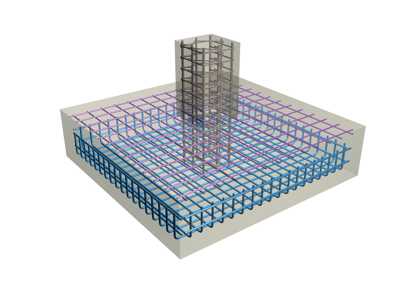 The footing is reinforced with an orthogonal wire mesh that may have horizontal and vertical bars of different diameter and spacing. Bending the rebars ends helps in the proper anchorage of the reinforcement.