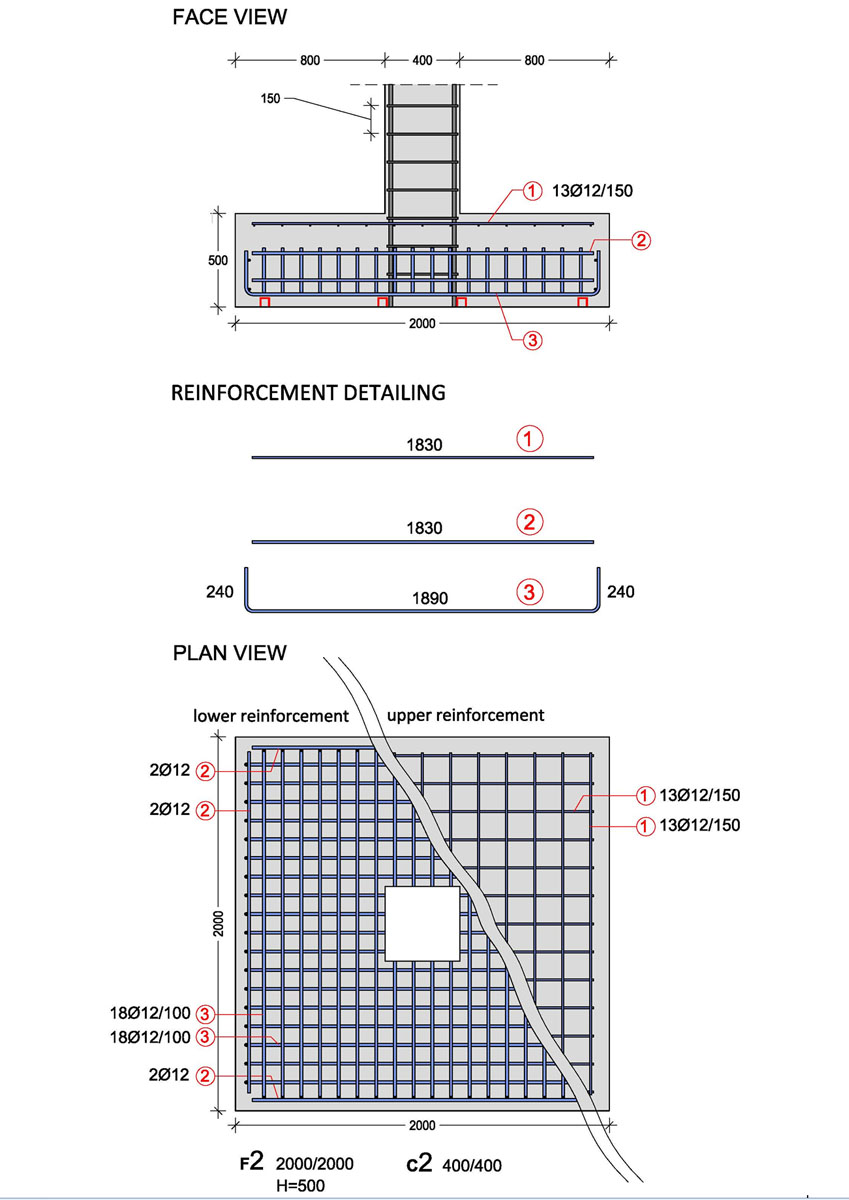 According to the rule of practice, the minimum allowable rebar diameter in a footing is Ø12 and the maximum acceptable spacing between the reinforcement bars is 150 mm.