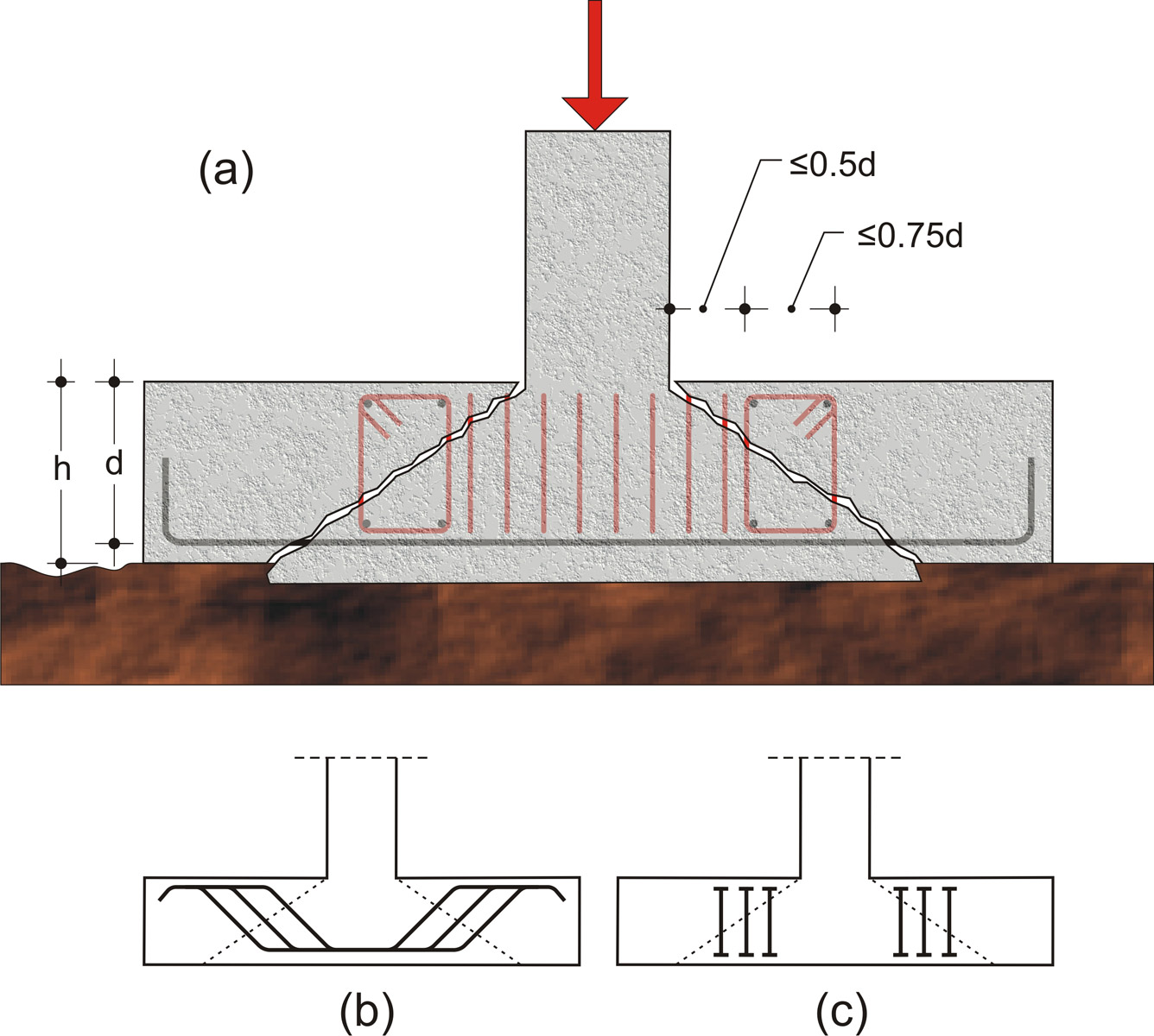 In this specific spread footing, punching shear is controlled by stirrup cages (figure a) however, it could be also controlled by bundles of properly bent-up rebars (figure b), or by special industrial elements (figure c).